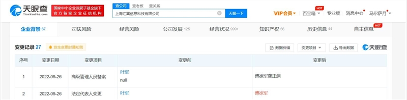 凤凰网科技讯9月29日消息,天眼查App显示,近日,Teambition关联公司上海汇翼信息科技有限公司发生工商变更,钉钉总裁叶军卸任法定代表人、执行董事,均由傅徐军接任。