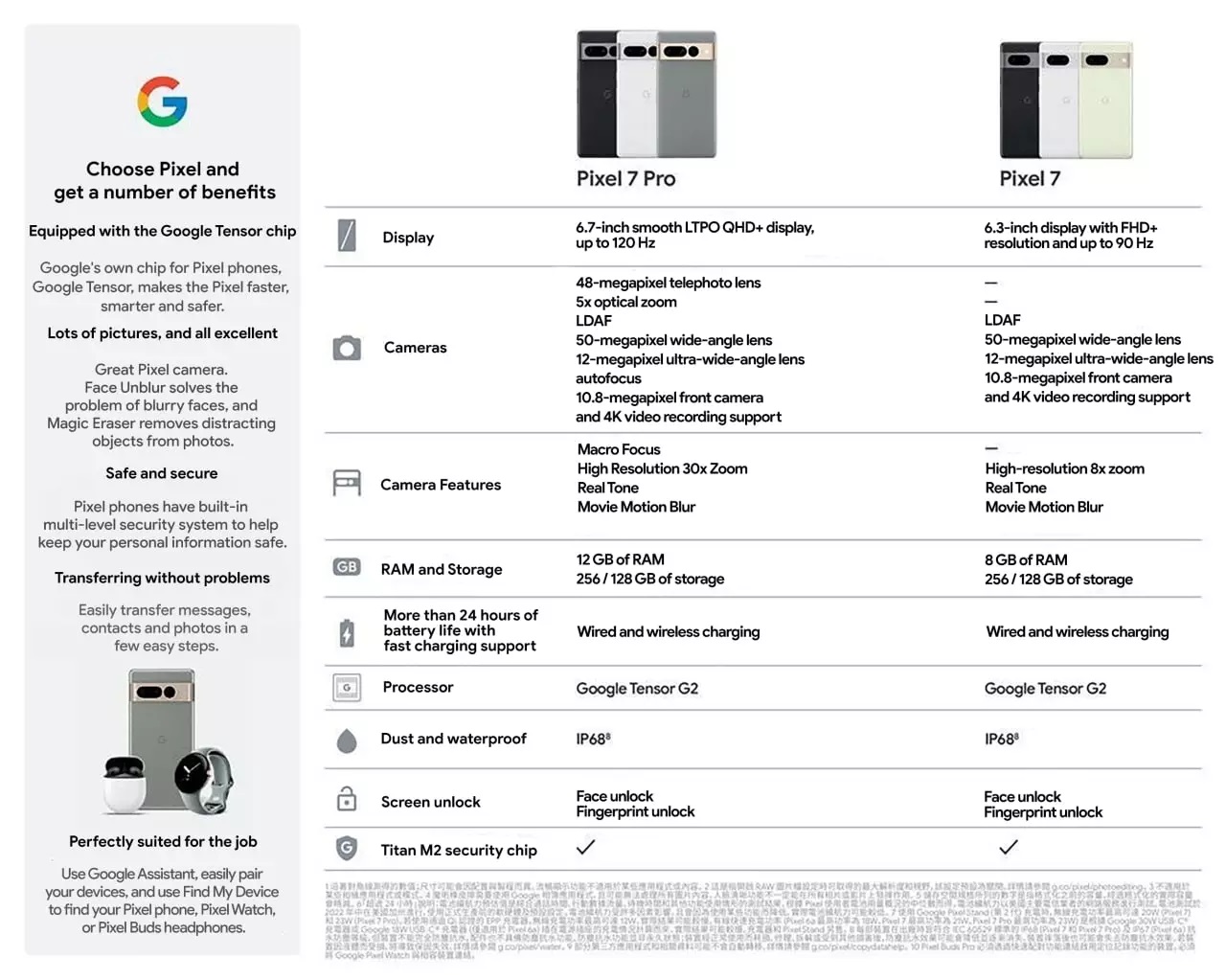 Pixel 7和Pixel 7 Pro都配备了Tensor G2芯片,将以128或256G的存储容量出售,防护等级为IP68,均支持面部解锁和指纹解锁。两台手机的摄像头配置有差别但有一些传感器是一致的:5000万像素的主后置摄像头,1200万像素的广角摄像头,以及一个1080万像素的自拍摄像头,可以录制4K视频。