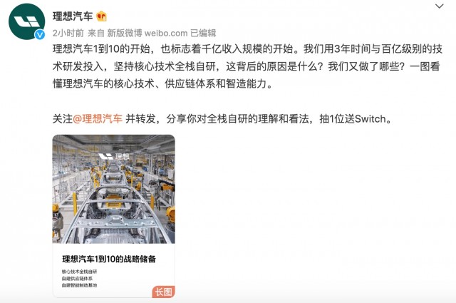 理想汽车创始人李想表示,“理想汽车1到10的开始标志着千亿收入规模的开始,我们用了3年时间与百亿级别的技术研发投入,实现了核心技术的全栈自研;通过自建工厂、成立控股合资公司两种方式自建供应链体系,保障核心技术的落地,以及质量和供应的稳定;坚持自建智能制造基地作为唯一的生产模式,并对产线本身进行大量研发投入,让生产机器的机器更智能,实现稳健地扩大生产规模。