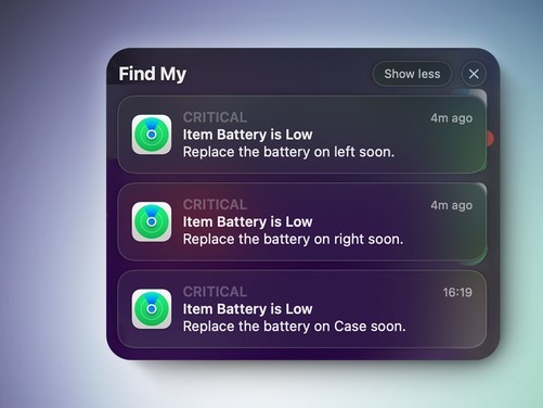 当 AirPods Pro2或 MagSafe 充电盒的电量不足时,似乎会有 Bug 触发附近设备上的 Find My 应用程序推送电池更换通知。
